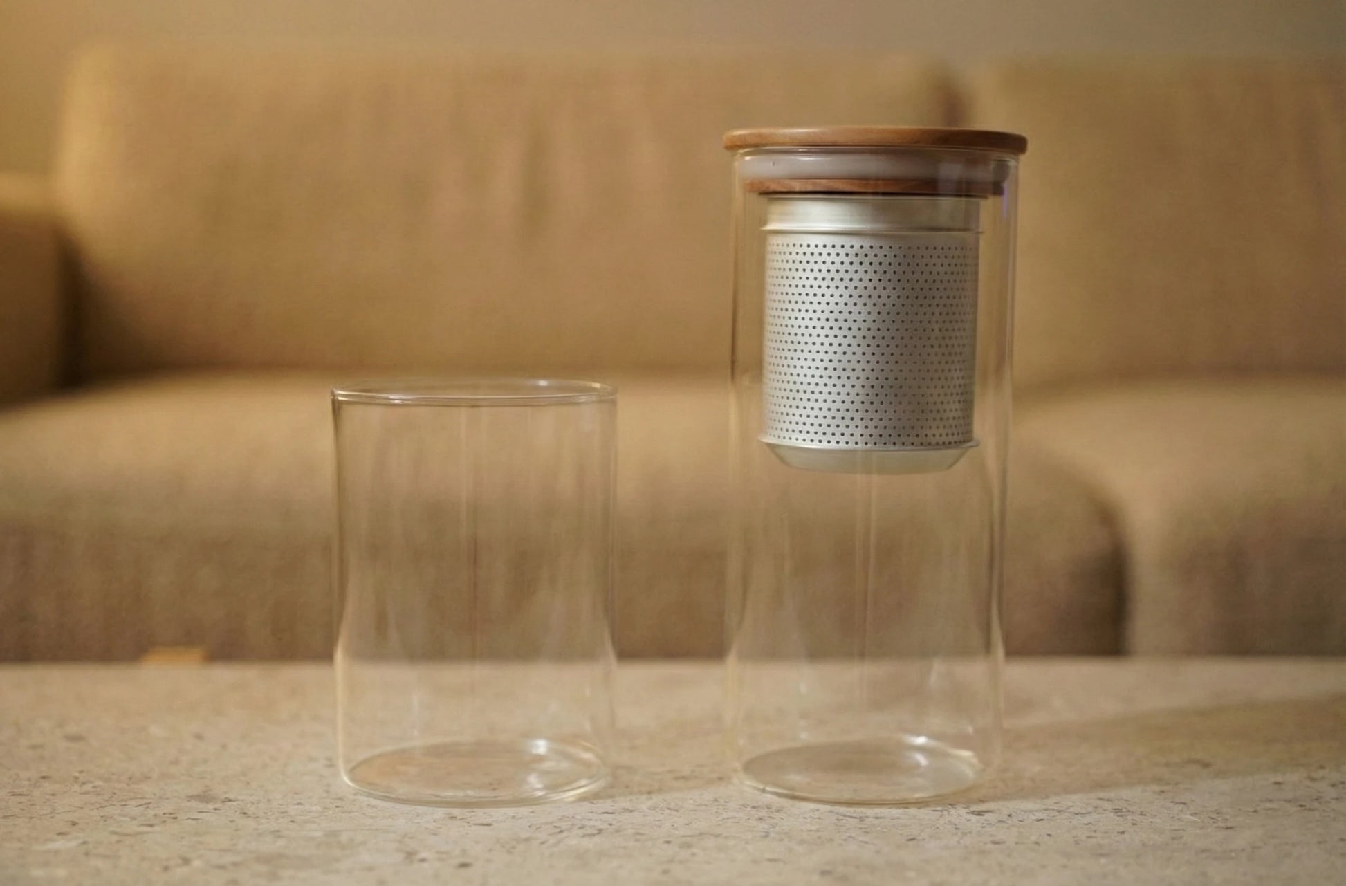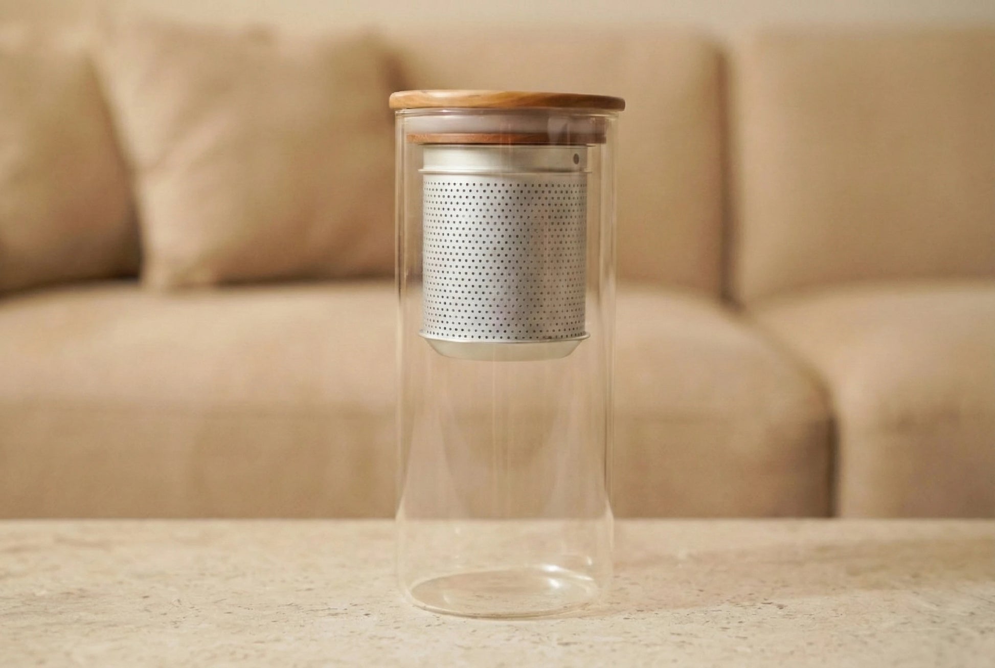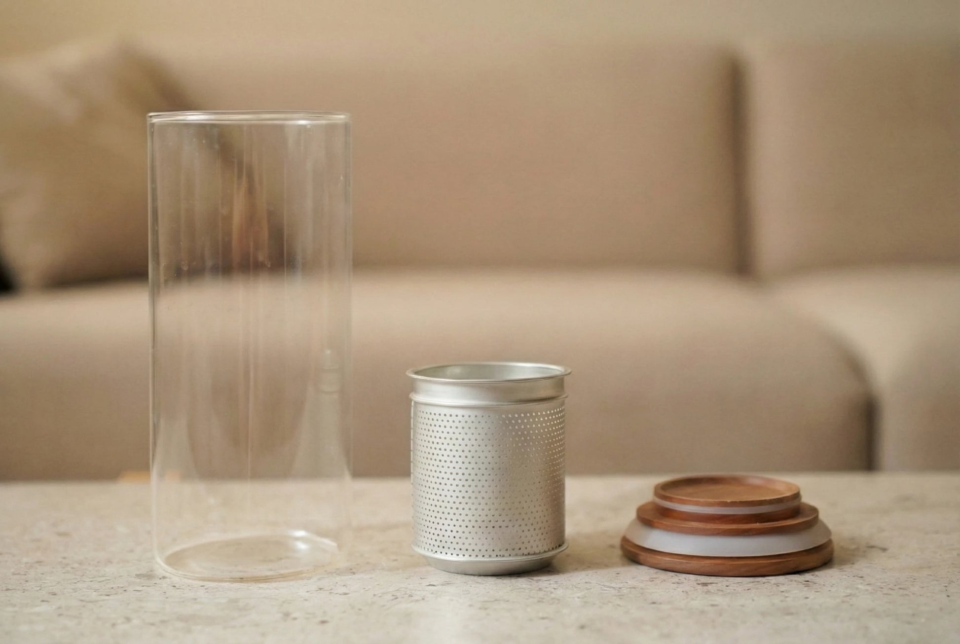 Picklestone T-Unit is a reusable cold-brew bottle for both Japanese tea and clear, natural broths. Place loose tea leaves, kombu, or other aromatics in the finely made copper-and-tin strainer, fill the glass bottle with water, and let it rest in the refrigerator for a slow, gentle extraction. The metal filter is crafted in Japan from high-grade materials, so it is durable, easy to rinse clean, and does not retain odors. A cherry-wood lid completes the plastic-free, BPA-free design and quietly echoes the look of the original Picklestone pickling jars, making T-Unit a sister piece that fits naturally into the same kitchen ritual.